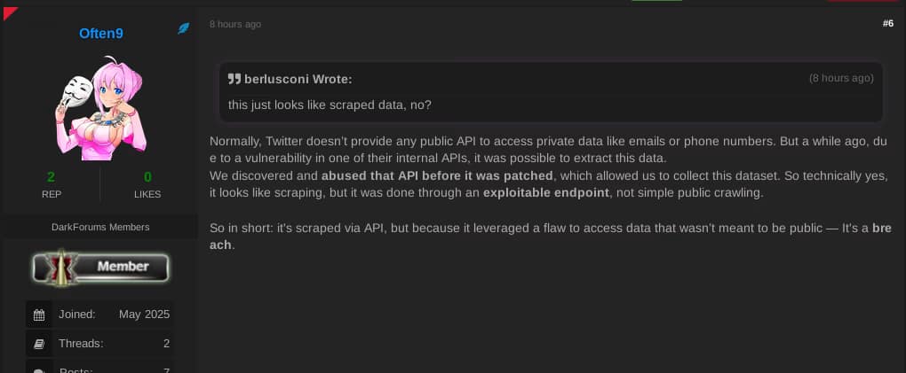 The actor clarified that while it may look like typical data scraping, it was actually made possible by a flaw in an internal API that TikTok had since patched. The exploit allowed the extraction of data that isn’t normally accessible to the public, making this more than just standard scraping—it’s a significant breach.