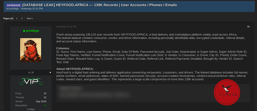 A threat actor using the alias, privilege, has exposed an alleged database of HeyFood.Africa, a popular food delivery and marketplace platform widely used in Nigeria. The dataset allegedly contains over 139,000 user records, including data from consumers, vendors, and drivers.