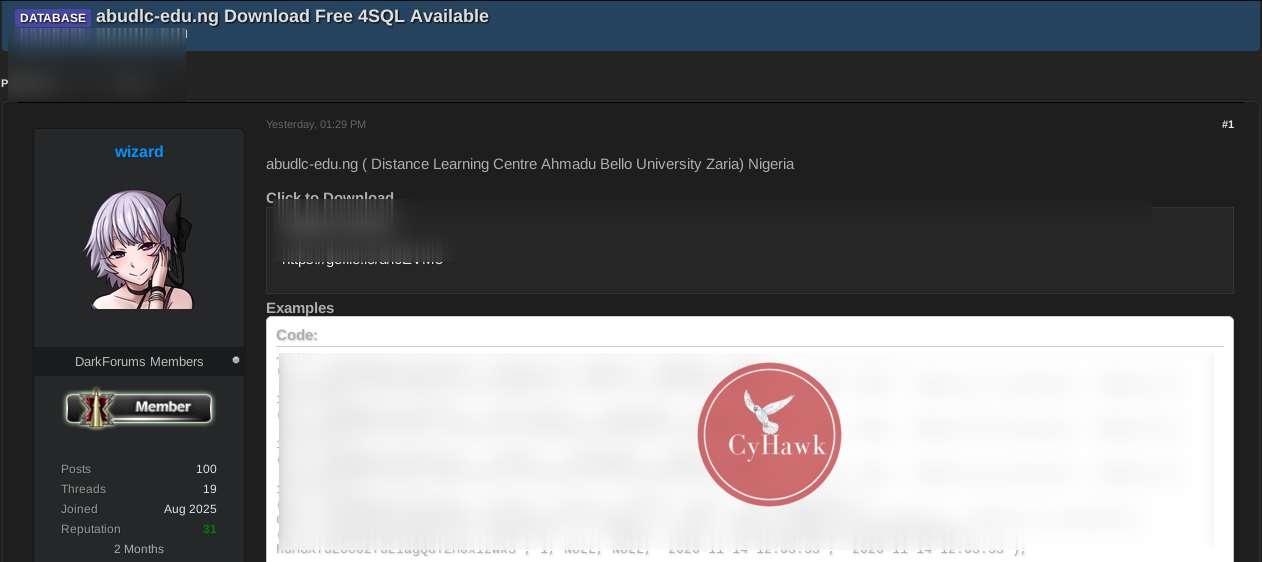 A threat actor on a popular dark web forum has shared a database allegedly belonging to the Distance Learning Centre of Ahmadu Bello University (ABU Zaria), Nigeria.