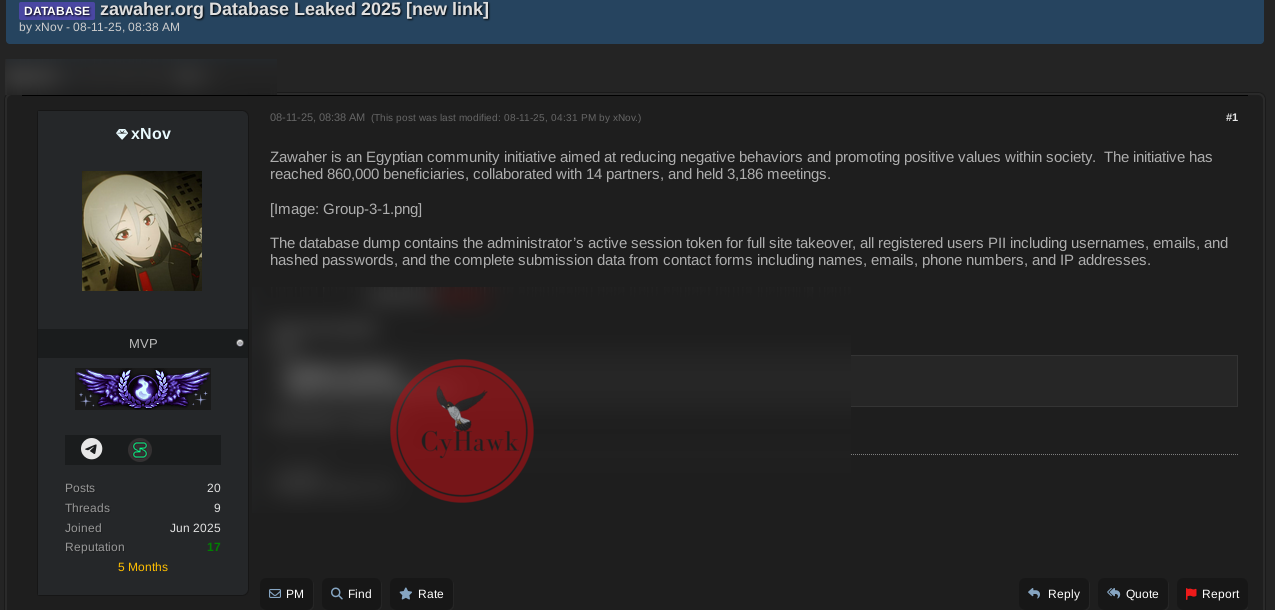 A threat actor using the alias has posted a database allegedly belonging to Zawaher.org, an Egyptian social community that aims to promote positive behavior and social values. The post appeared on a dark web forum with a downloadable link to the full database.