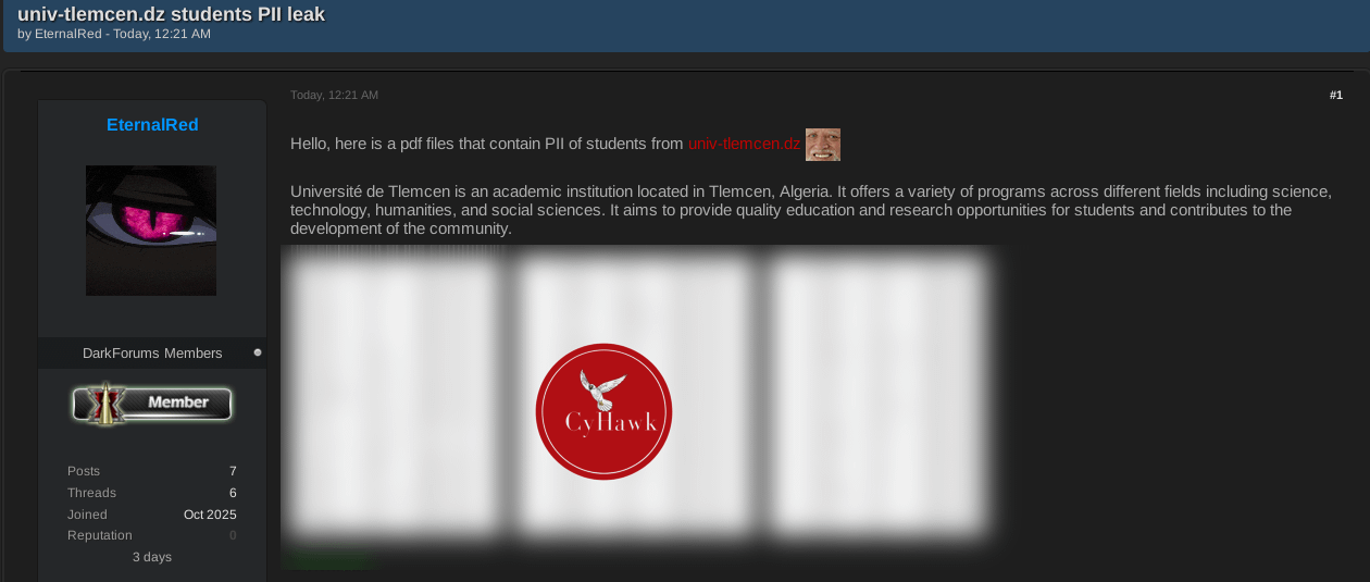 A threat actor, “EternalRed” has published what they claim to be personally identifiable information (PII) belonging to students of Université de Tlemcen, a public academic institution located in Tlemcen, Algeria.