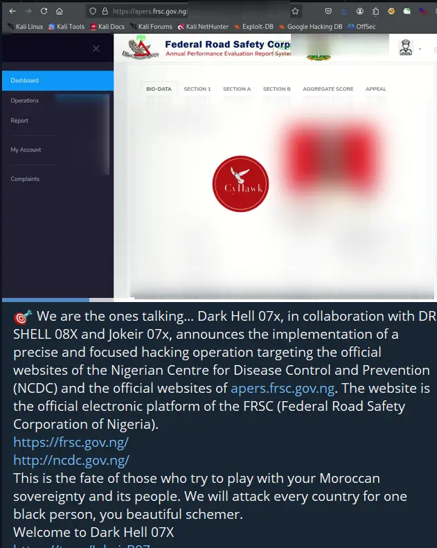 Threat actor and Hacktivist, Dark Hell 07x, in alliance with DR SHELL 08X and Jokeir 07x, has claimed responsibility for a breach of two critical Nigerian government platforms: the Nigerian Centre for Disease Control and Prevention (NCDC) and the Federal Road Safety Corps (FRSC).