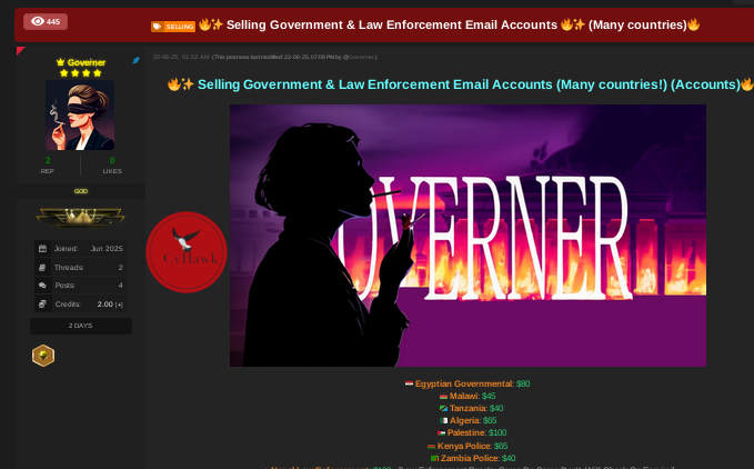 We have identified a new post on one of the dark web markets, where a threat actor going by ‘Governer’ is selling government and law enforcement email accounts from several African countries, with a clear list of prices per country.