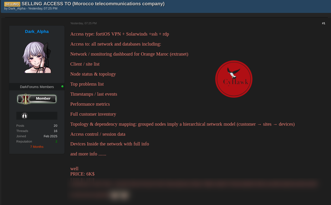 Threat actor, Dark_Alpha has surfaced on a dark web forum advertising an alleged unauthorized access to the internal network and databases of a Moroccan telecommunications company. The offer includes full network visibility, customer information, and administrative access tools, suggesting a high-risk exposure of the organization’s infrastructure.